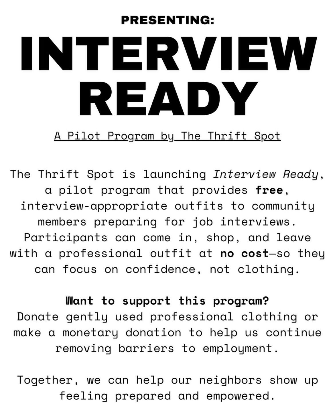 Participants can come into the Thrift Spot ATL, shop, and leave with a professional outfit at no cost! Focus on confidence, not clothing!